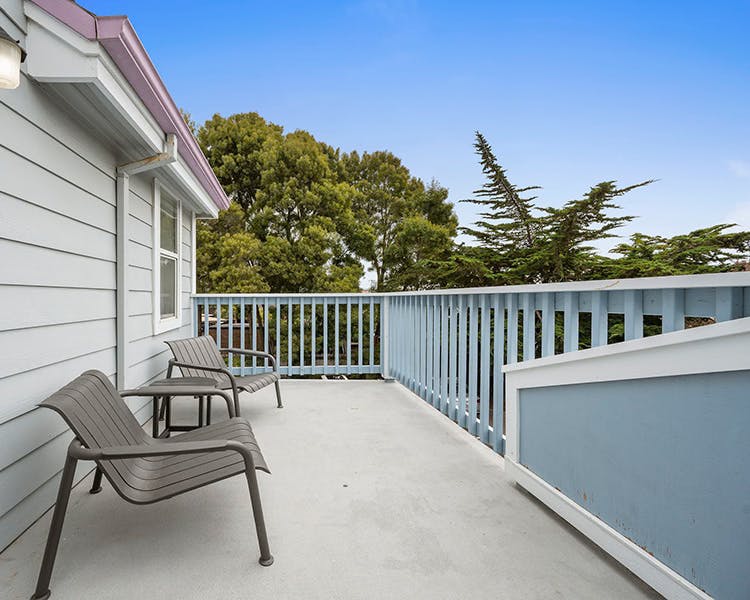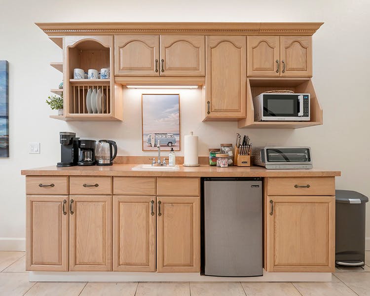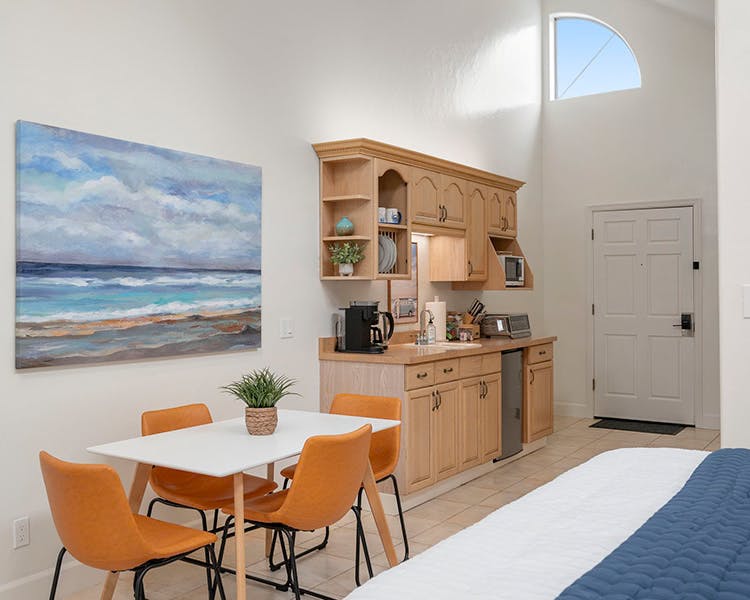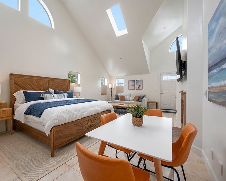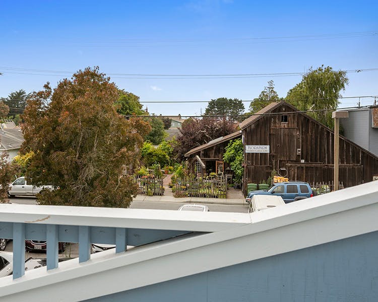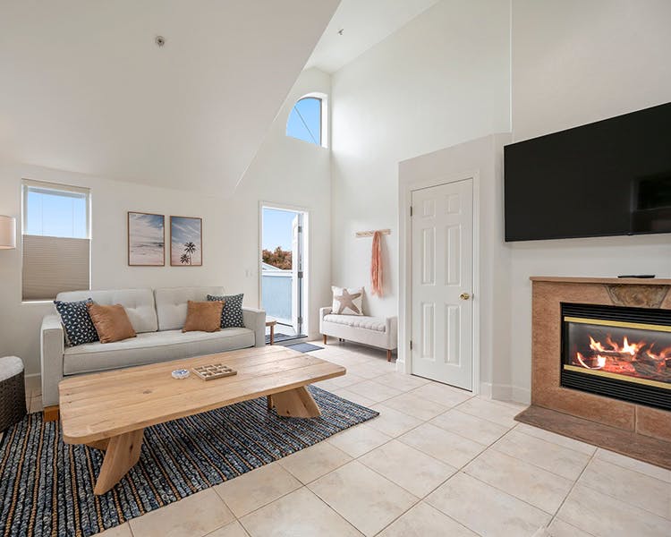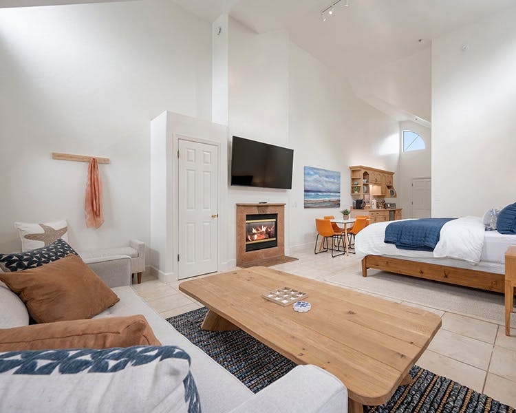 Located above the heart of historic downtown Half Moon Bay, the Montara Penthouse offers a warm and inviting coastal retreat. This airy, high-ceiling suite features a plush king-size bed, a spa-style bathroom with a relaxing jacuzzi tub/shower combo, and a bright living room complete with a cozy fireplace, flat-screen TV, and comfortable sofa bed—perfect for couples or small groups seeking comfort and charm by the sea. A compact kitchenette with an under-counter refrigerator, single-element black induction cooktop, blender, kettle, toaster, coffee maker, microwave, and basic kitchen essentials. Step outside to your private back deck—an ideal setting to enjoy morning coffee or a glass of wine while taking in the ocean air and elevated views over the rooftops of downtown Half Moon Bay.